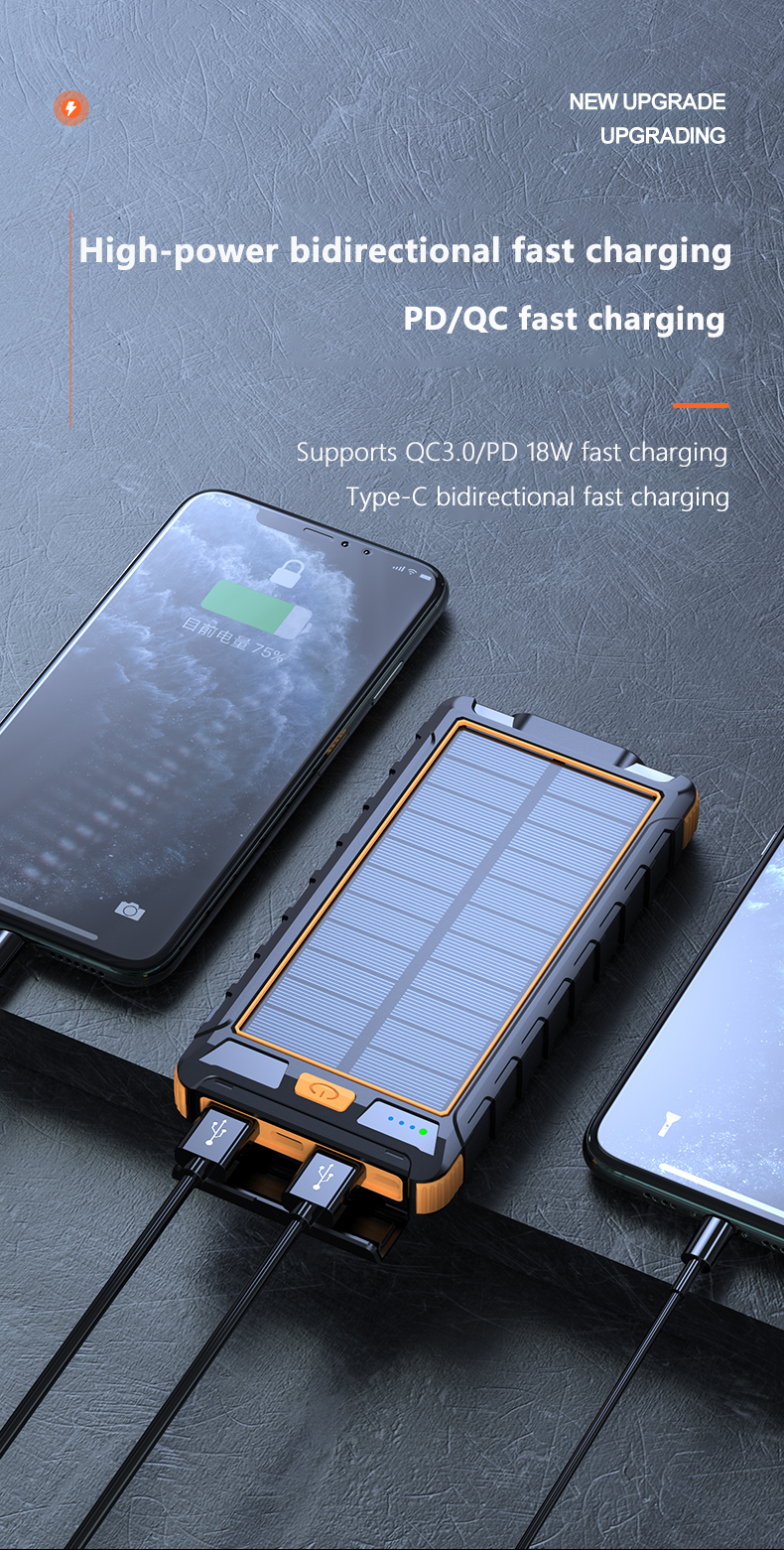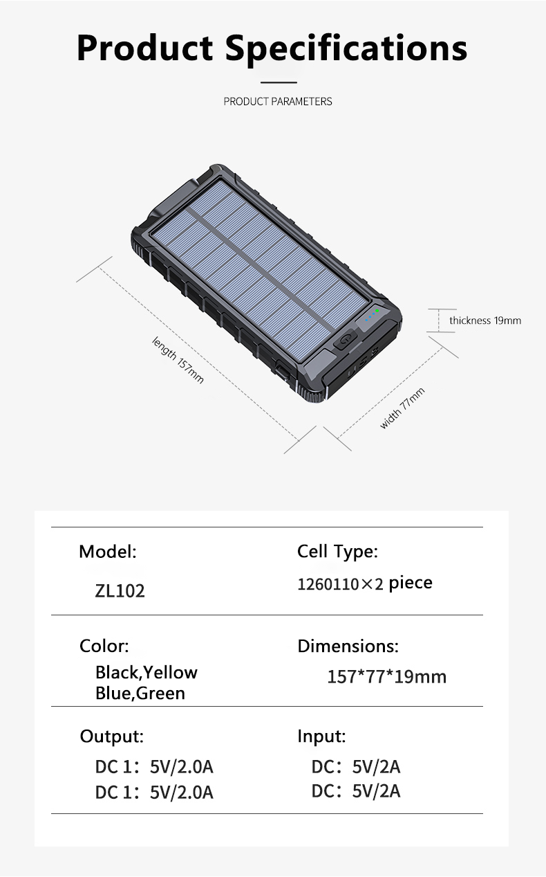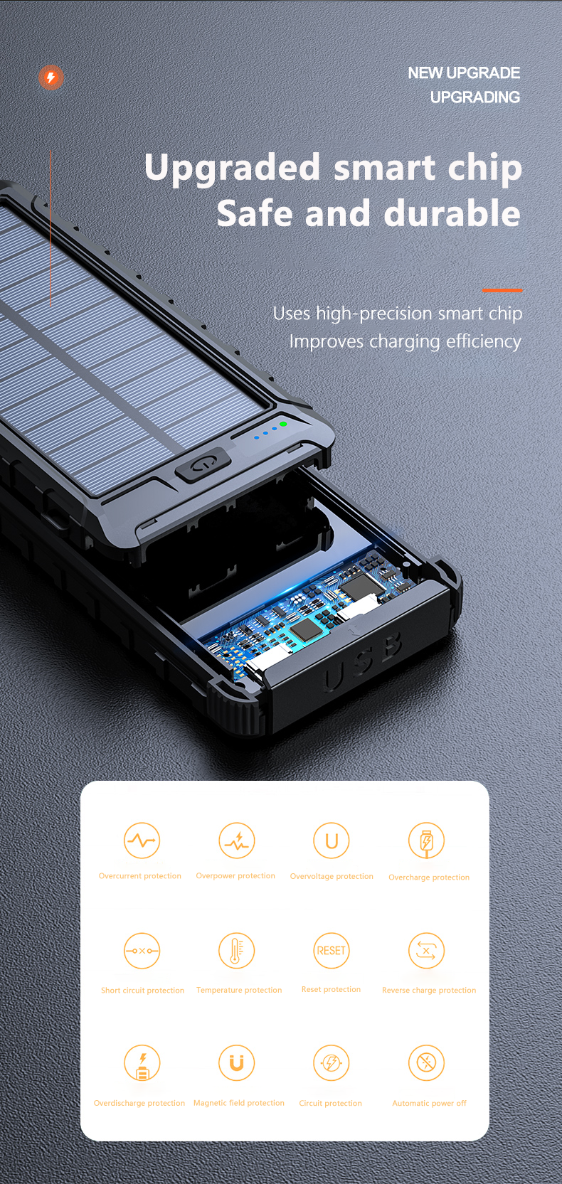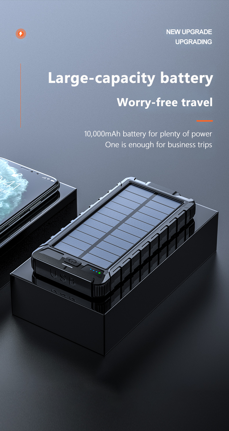 • 【Top Grade A+++ Battery】This Solar Charger Power bank built in Grade A+++ 10000mAh anti-explosion Lithium polymer battery, the solar power bank have more than 3000 times full cycle recharging lifetime, 10000mAh capacity offer huge energy to your devices , Smart IC Chip protects your devices from overcharging, over-current, over-voltage, and short circuits.